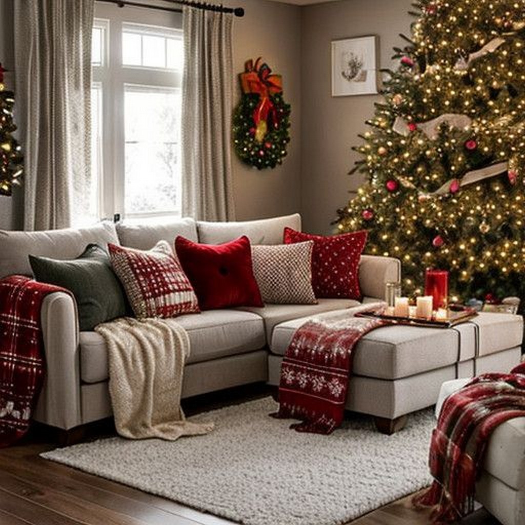 Use decorative pillows with Christmas-themed patterns in red and green to enhance the holiday vibe.