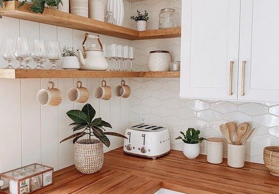 Place potted herbs, succulents, or small plants on open shelves to add a touch of nature and freshness to your kitchen.