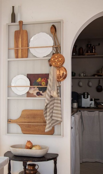 Add plate racks to your open shelves for a functional and decorative way to display your dishware. This works well for vintage or decorative plates.