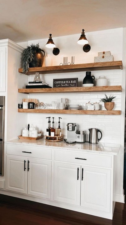 Floating shelves are a popular choice for open shelving in the kitchen. They create a modern, airy look and can be customized to fit your space and style.