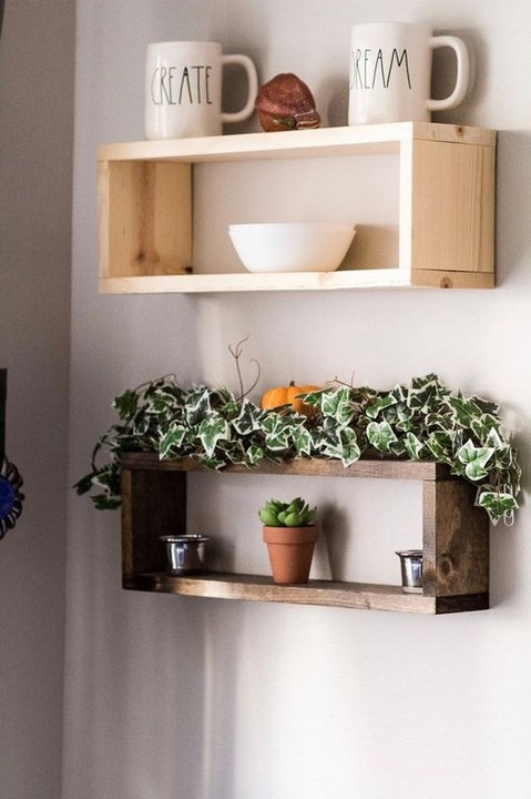 Install box-shaped floating shelves for a unique and artistic display. These can be staggered at different heights for added visual interest.