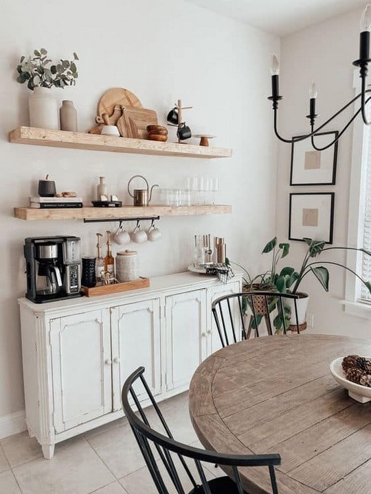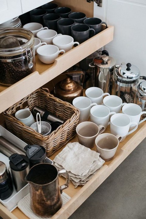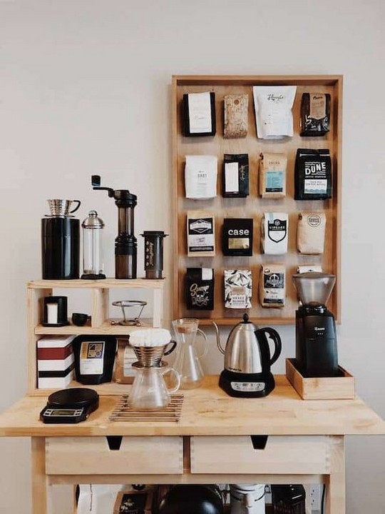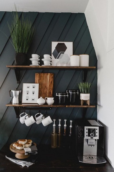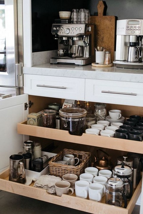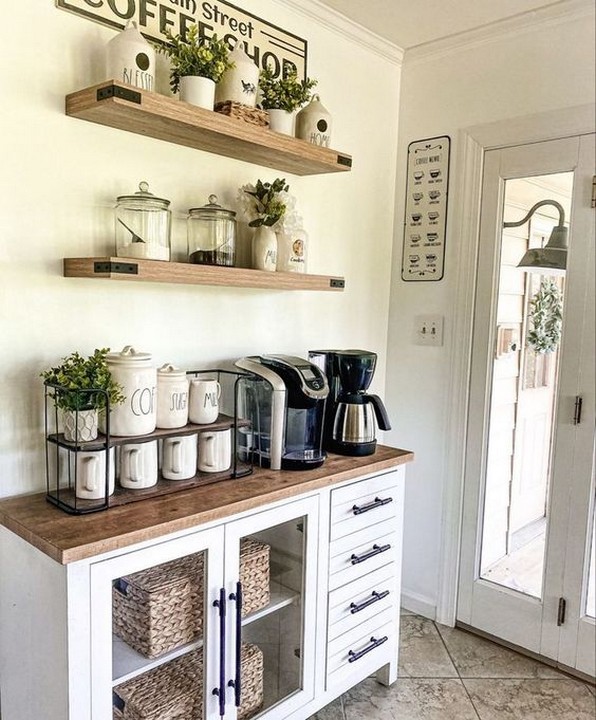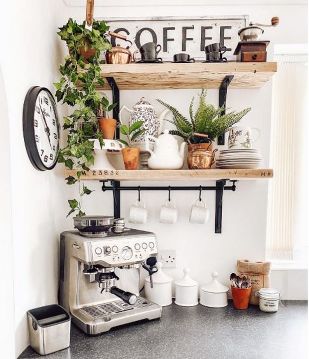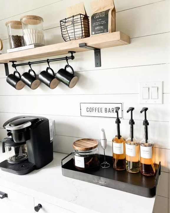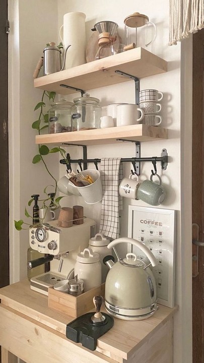 Install shelves, cabinets, or open shelving units above or near your coffee station to store coffee mugs, coffee beans, filters, and other coffee-related items.