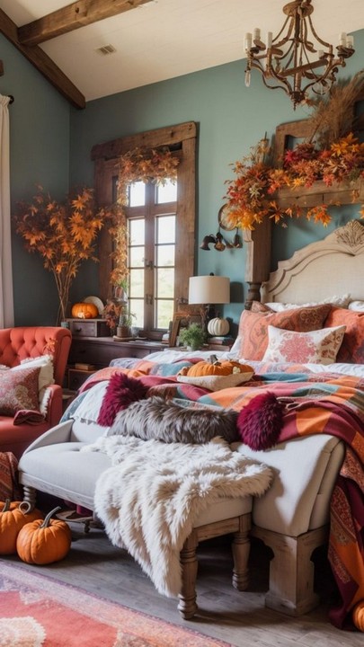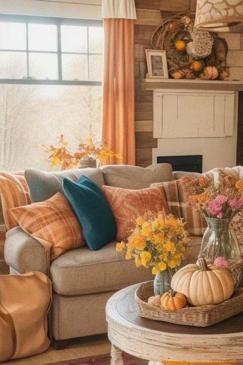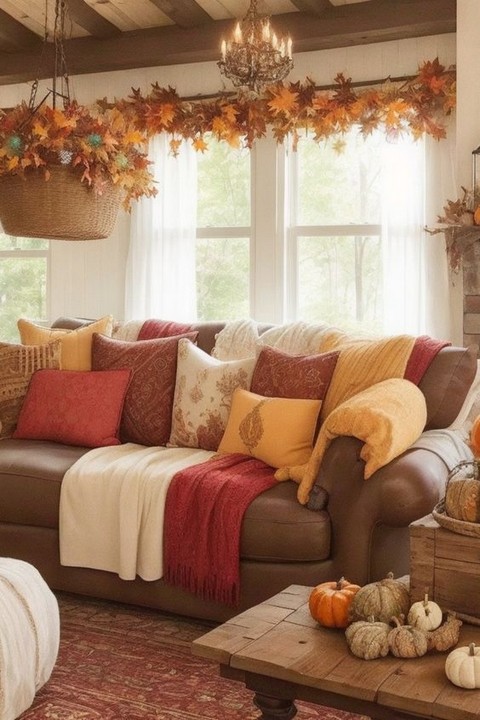 Layer your home with cozy textiles such as throw blankets, plush cushions, and area rugs in autumnal colors and patterns.