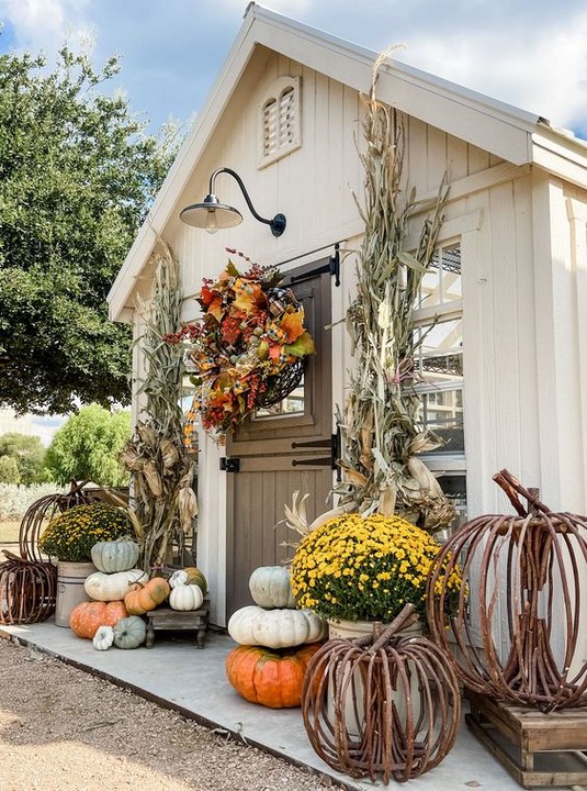 Extend your fall decor to the exterior of your home with pumpkins, cornstalks, hay bales, and seasonal potted plants.