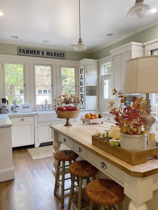 Display seasonal fruits and vegetables like apples, pumpkins, and squash in your kitchen. Incorporate cozy textiles and autumn-themed kitchen accessories.