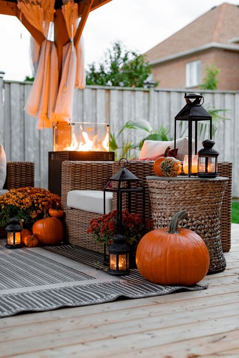 Decorate your front porch with cozy seating, outdoor rugs, and an abundance of pumpkins, gourds, and seasonal wreaths.