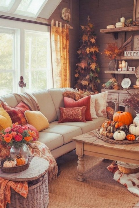 Decorate with pumpkins and gourds of various sizes and colors. You can paint them, arrange them in baskets, or carve them for unique decorations.