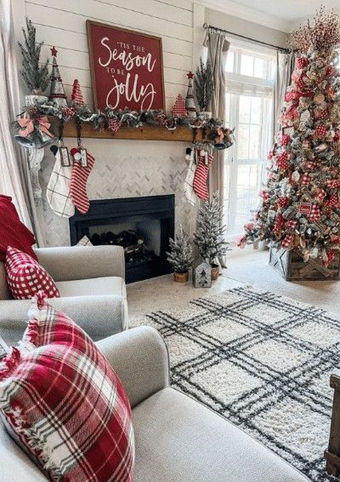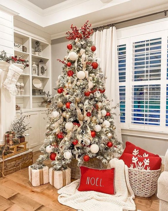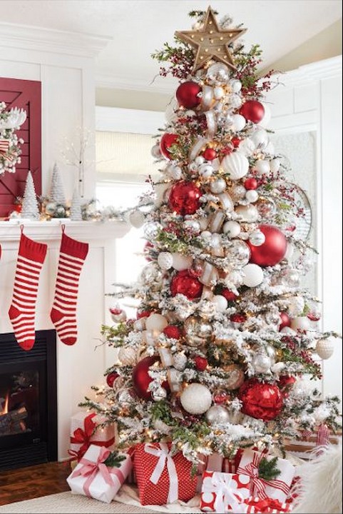 Classic red and green ornaments, ribbons, and garlands never go out of style. Add white lights for a timeless look.