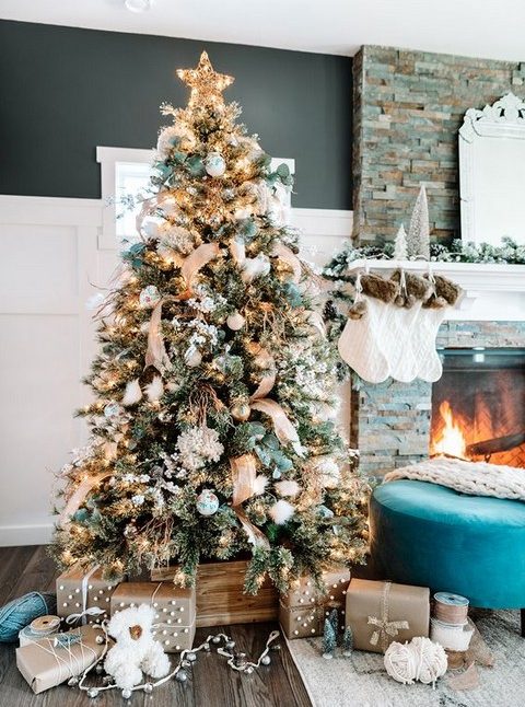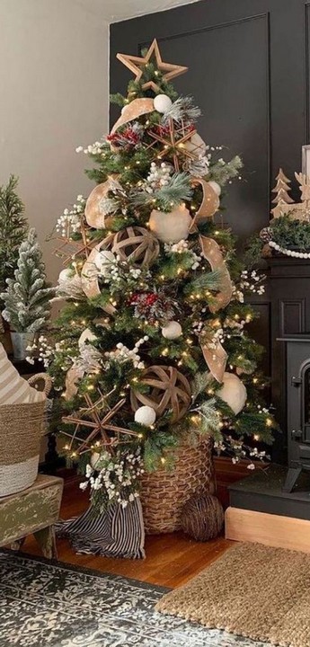 Use burlap ribbons, wooden ornaments, and pinecone garlands for a cozy, rustic look. Incorporate vintage or handmade ornaments for added charm.