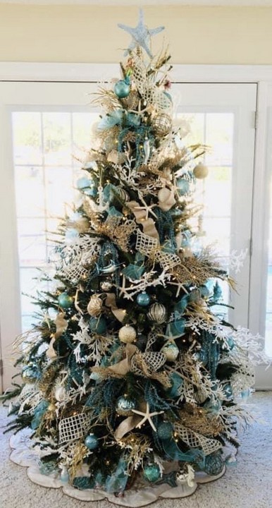 Create a coastal feel with seashell and beach-themed ornaments, starfish toppers, and blue and white colors.