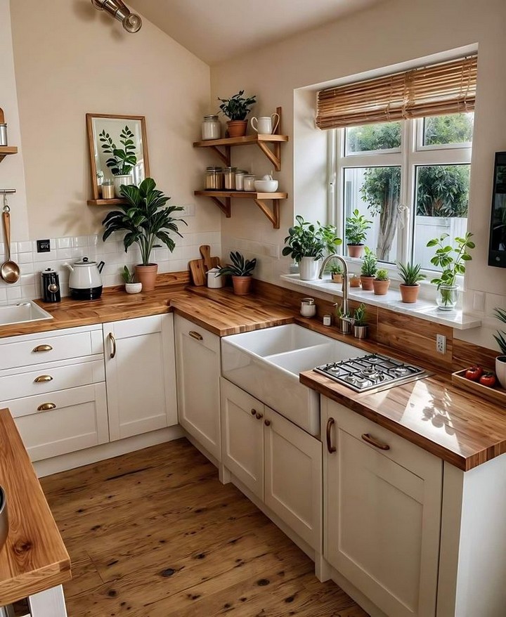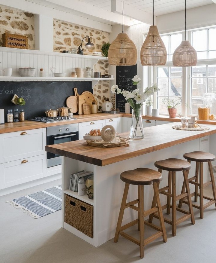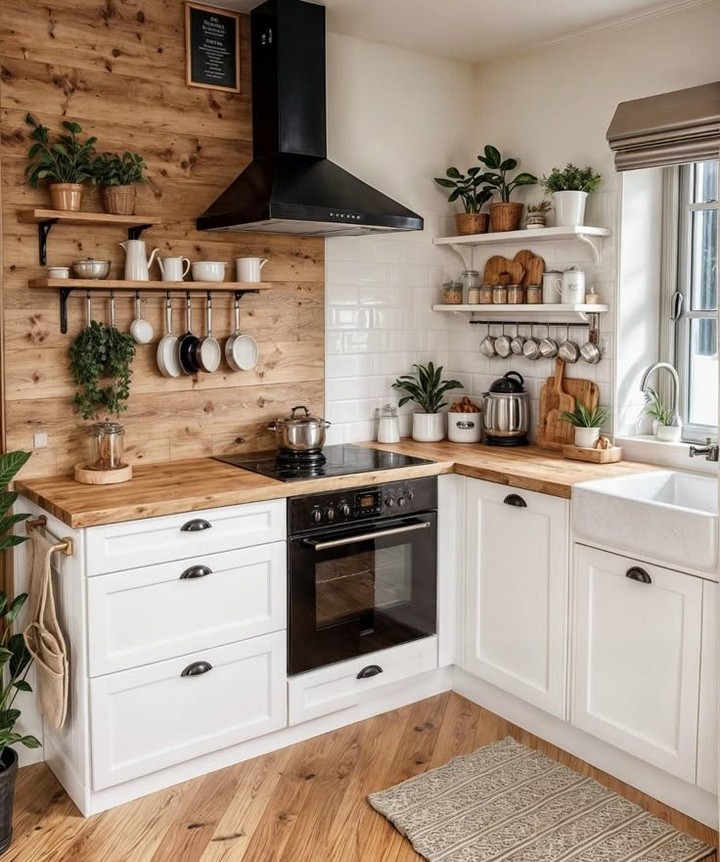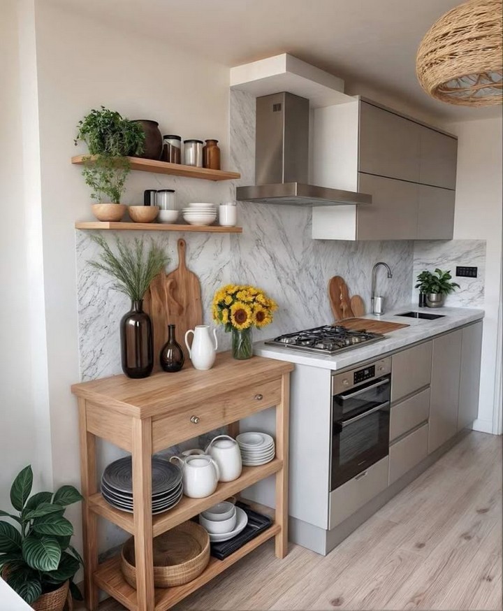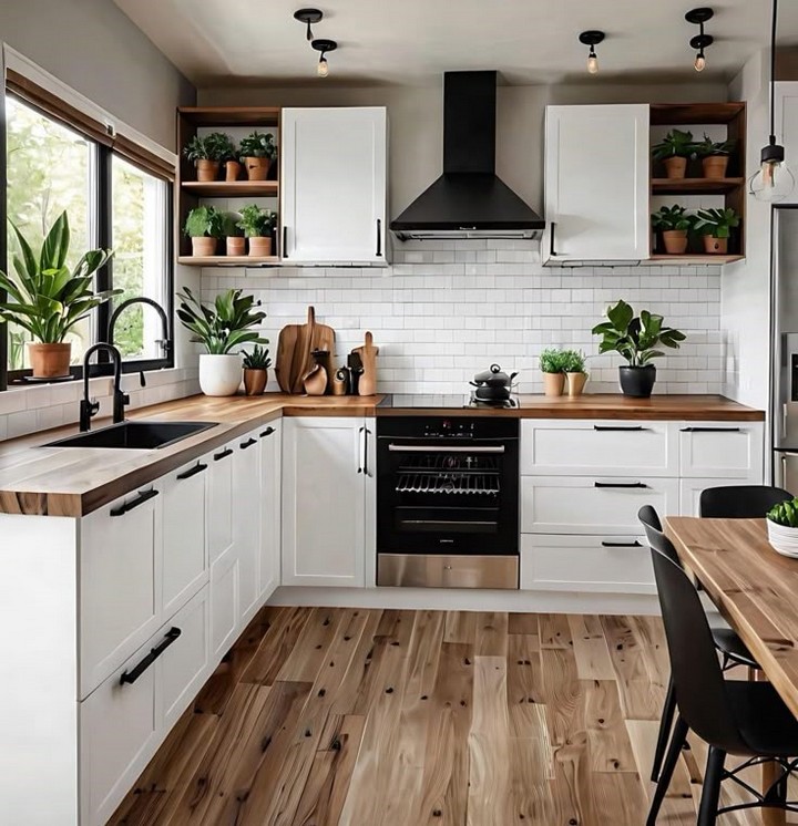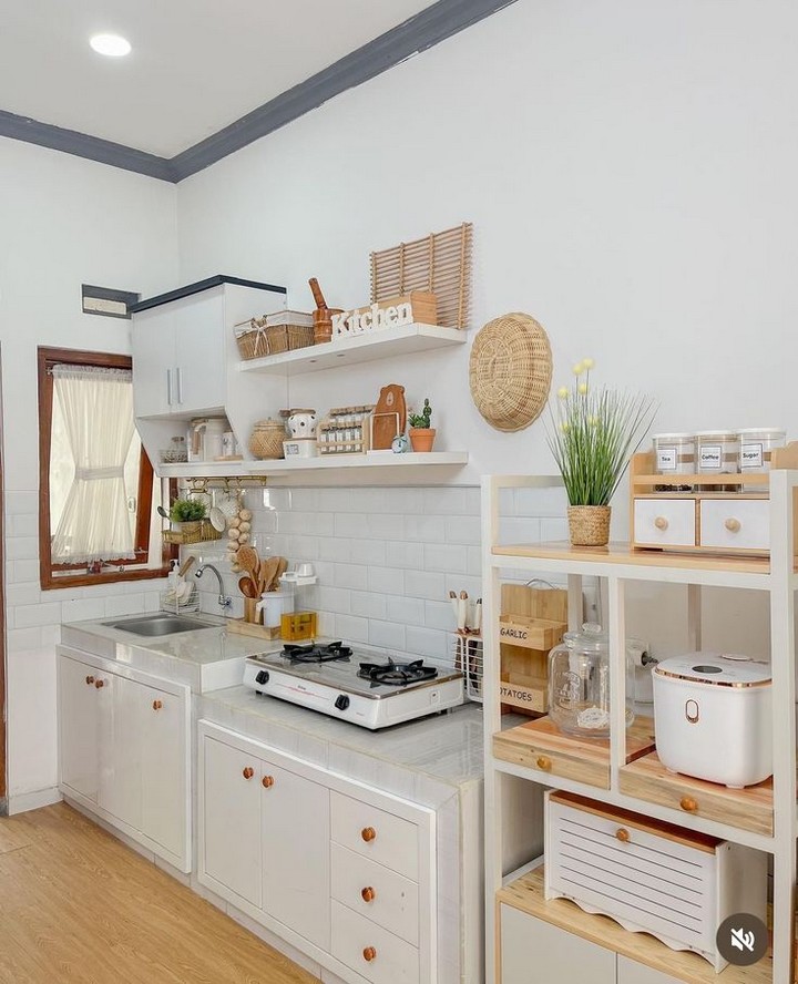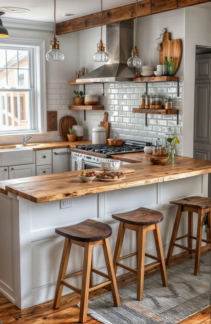 Swap bulky upper cabinets for minimalist open shelves. This not only saves money on cabinetry but also makes your kitchen feel larger and airier. Display essentials and pretty dishware for both function and decor. Choose unfinished wood or painted planks for an affordable DIY option.