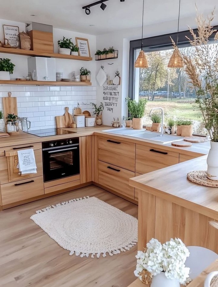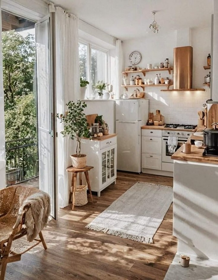Apply peel-and-stick wallpaper to a single wall, cabinet doors, or even the refrigerator for a stylish accent. Boho patterns, botanicals, and geometric prints add personality without a long-term commitment. It’s an affordable and reversible way to inject color into your kitchen.