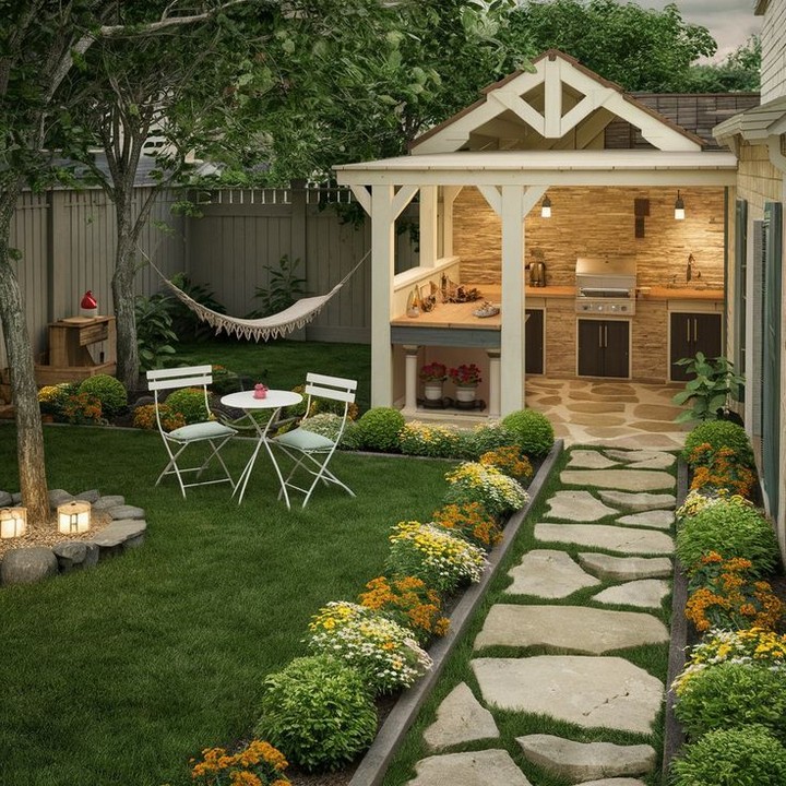 No backyard is complete without a place to enjoy meals outdoors. If your backyard is small, a compact dining nook with a bistro table and chairs can work wonders. Choose folding furniture to save space when not in use. Add string lights or lanterns for a cozy ambiance, perfect for evening meals or gatherings with friends.