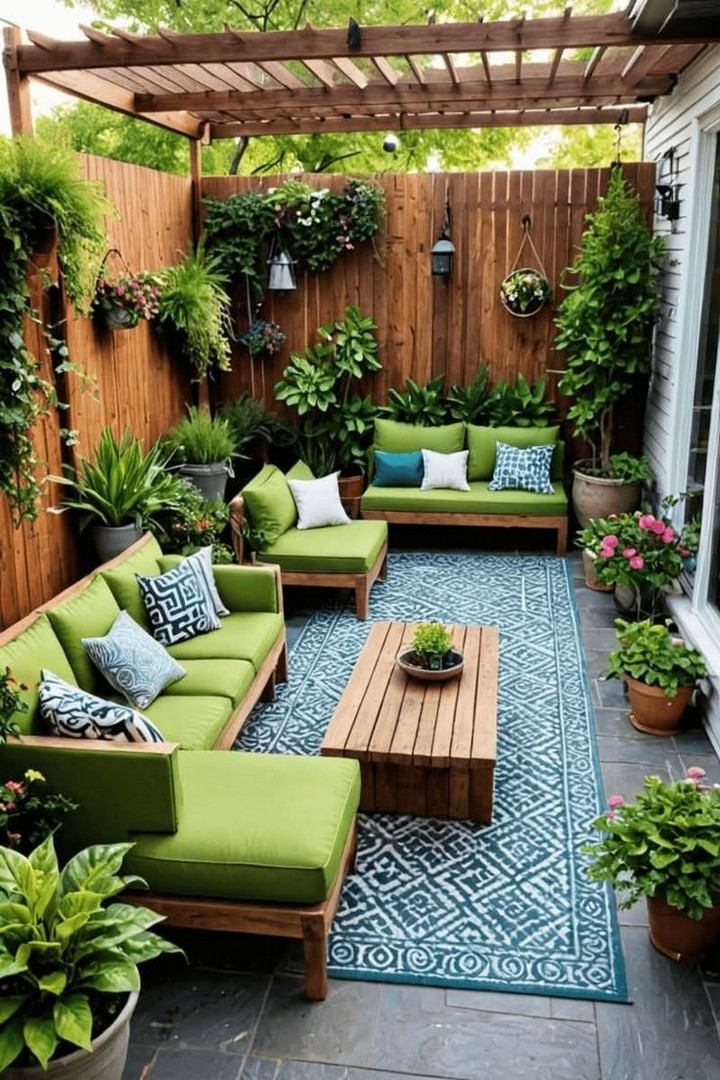 An outdoor rug can bring warmth, color, and style to your small backyard. Whether placed on a patio, under a dining area, or in a lounging space, an outdoor rug can define different areas and make the space feel more inviting. Choose a rug that complements your overall decor while withstanding outdoor conditions. Look for rugs made of synthetic materials that are mildew-resistant and easy to clean.