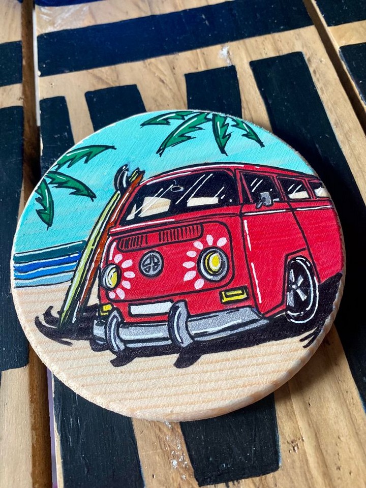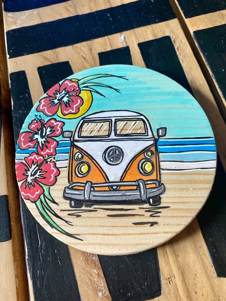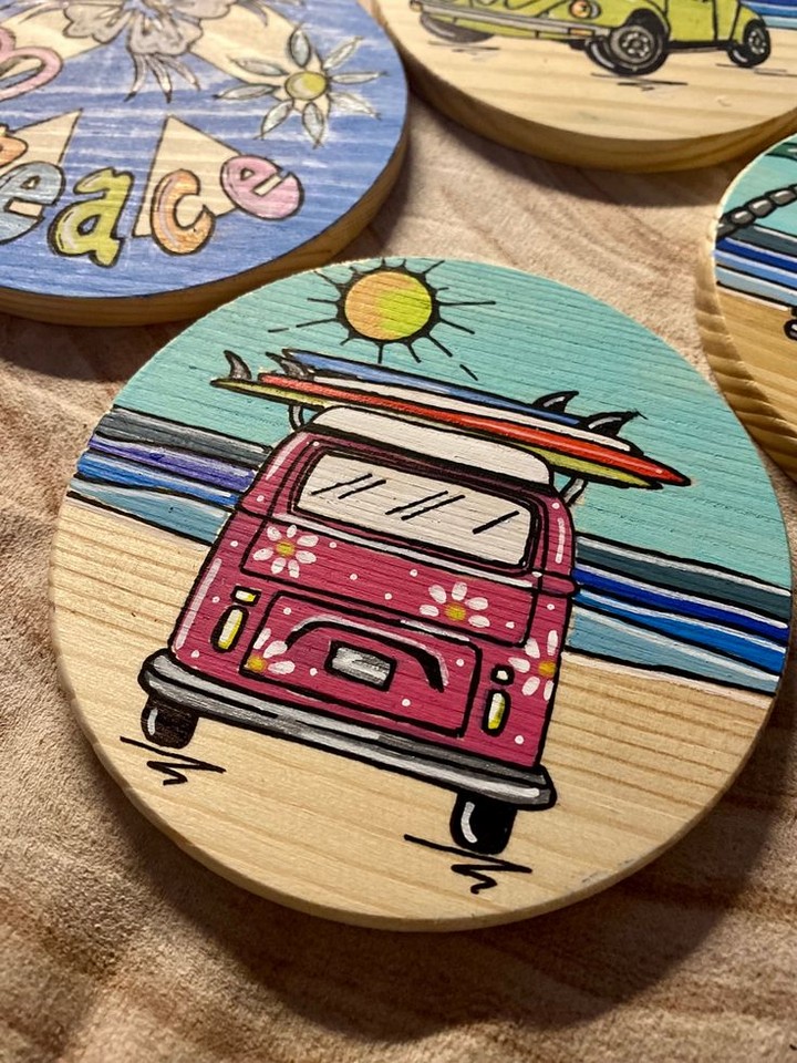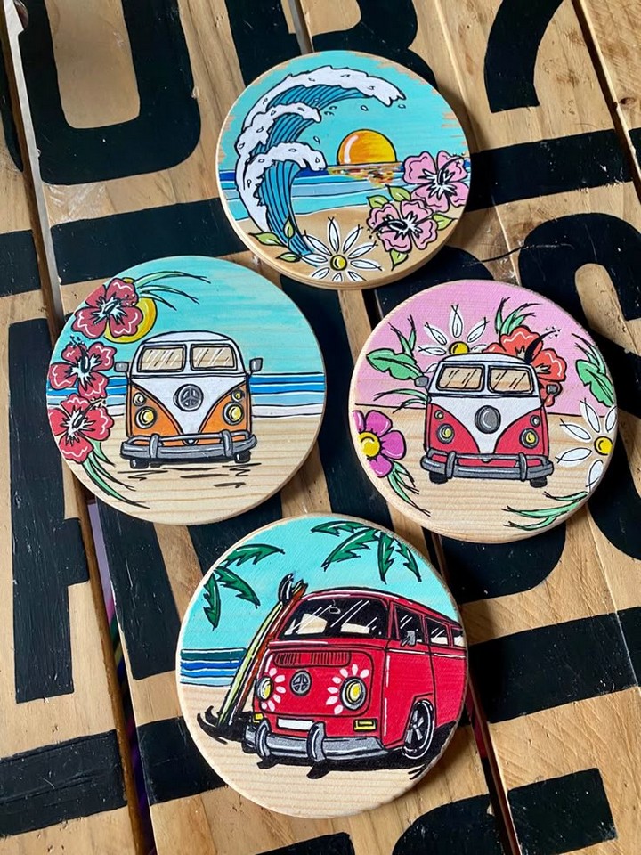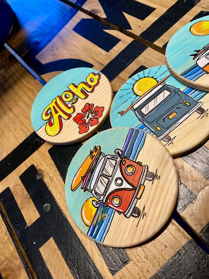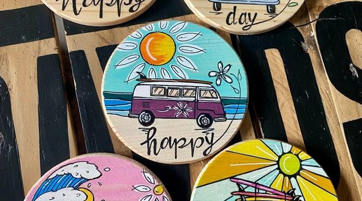 Materials Needed: Small wooden slices, acrylic paints, fine-tip brushes, varnish.