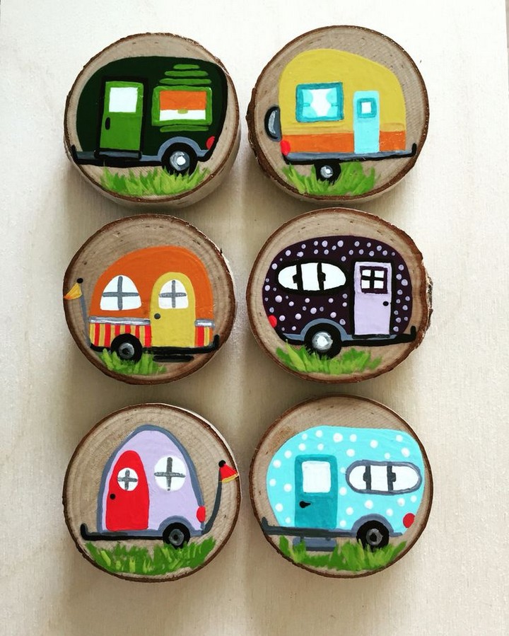 Create a set of mini wooden slice magnets for your fridge or metal surfaces. Paint or burn camping-themed designs like tents, campfires, or canoes, and attach small magnets to the back. These are perfect for gifting or adding a touch of camping flair to your home.
