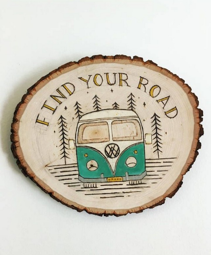 Materials Needed: Various-sized wooden slices, paints, wood-burning tool, hanging hardware.