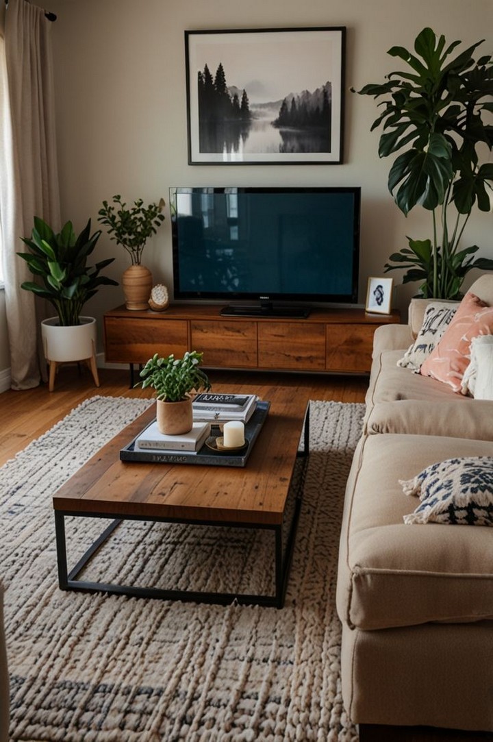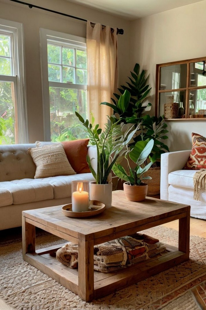 Bring the outdoors in by pairing brown decor with green accents like indoor plants or green throw pillows. This combination creates a fresh and organic vibe. A natural-themed living room with brown furniture and lush indoor plants.