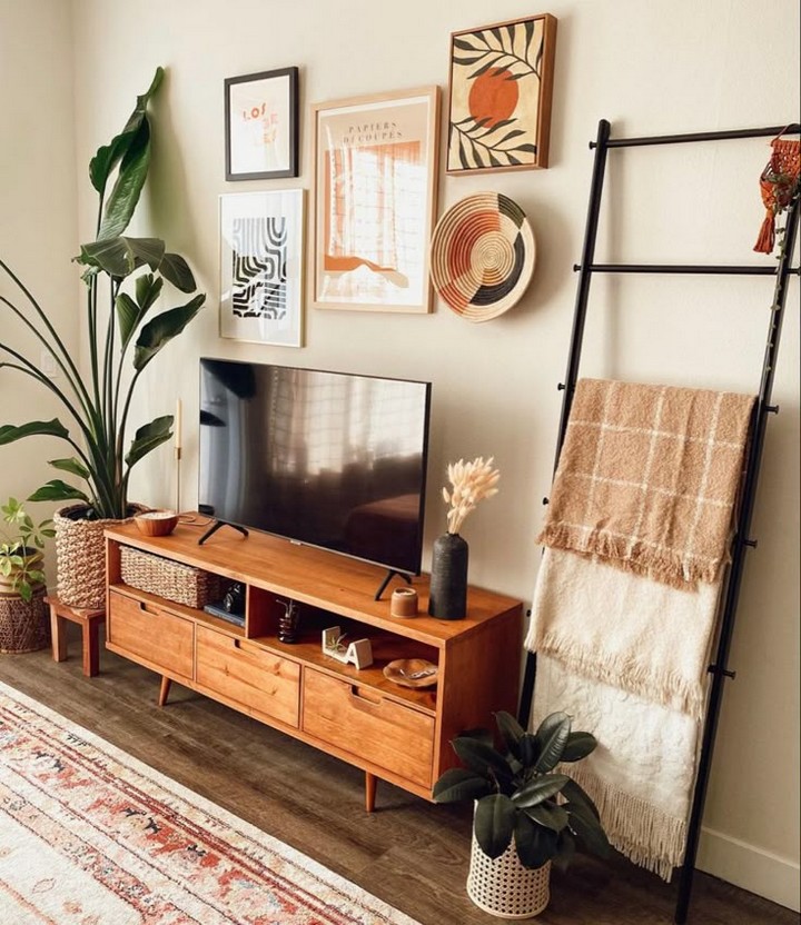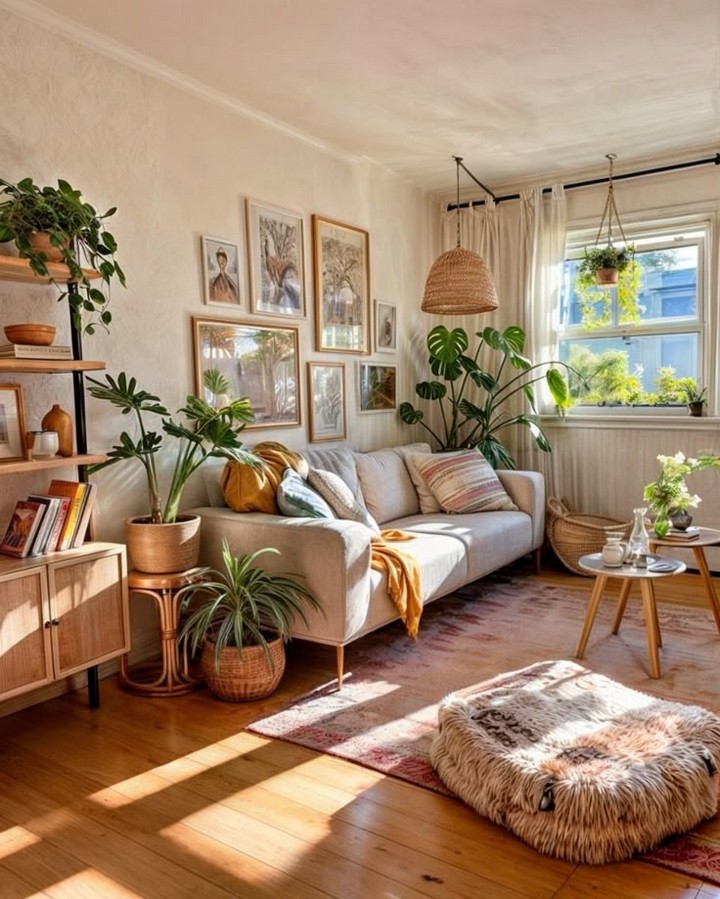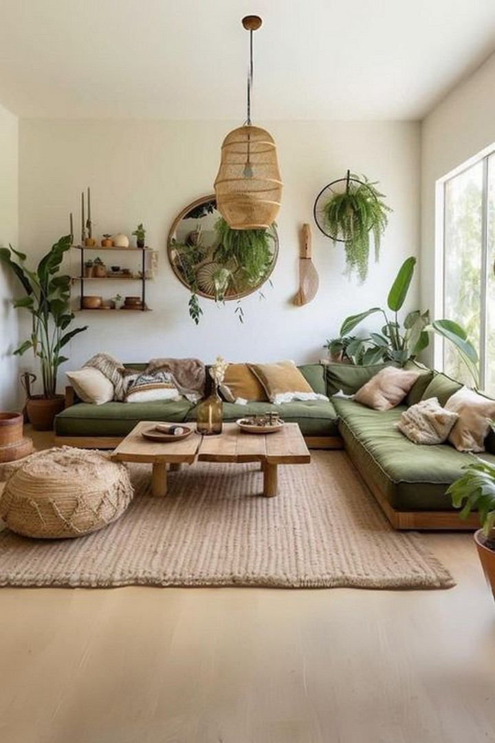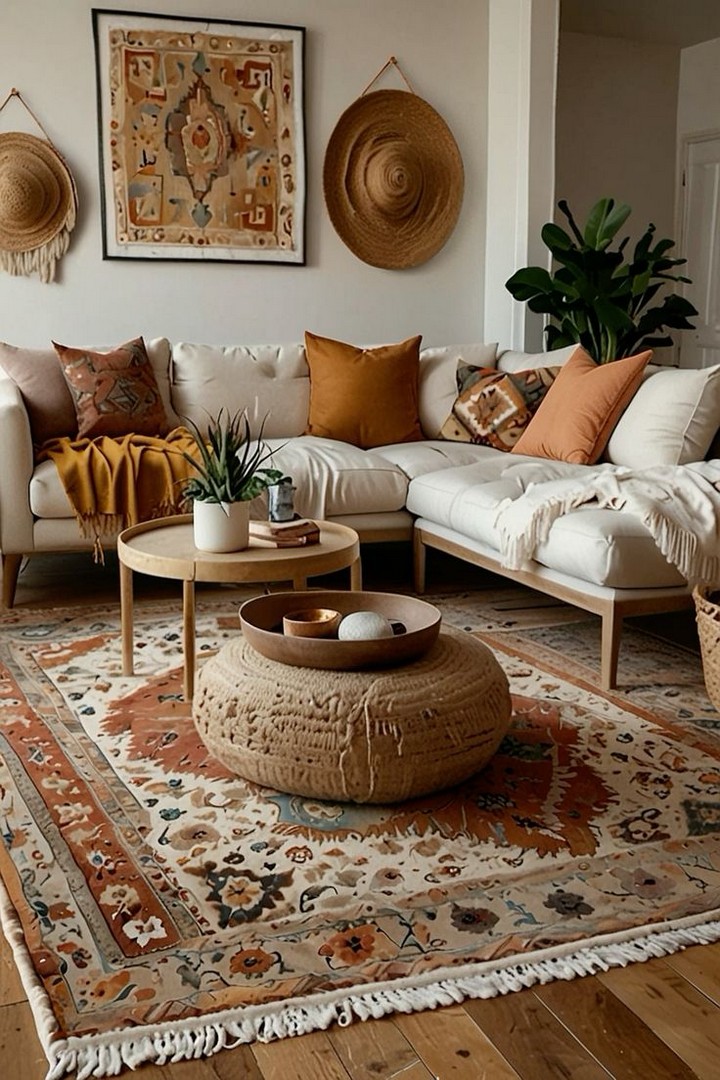 Combine brown tones with earthy textures like jute rugs and rattan furniture. These materials add a casual yet stylish vibe, perfect for bohemian-inspired spaces. Bohemian living room with brown tones and rattan furniture.
