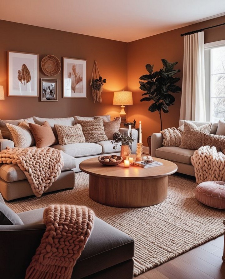 Layering textiles like brown throw blankets, cushions, and curtains can add a sense of comfort and depth to your living room. Living room styled with brown throw blankets and cozy cushions.