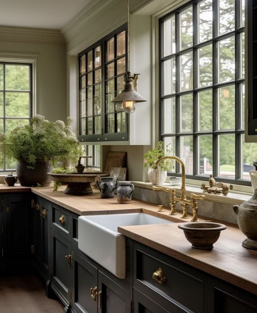 Design a farmhouse-style kitchen with a large, functional island. Consider open shelving, a farmhouse sink, and pendant lighting for an authentic look.