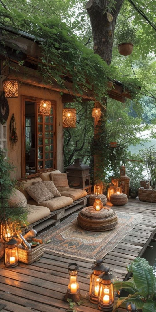Extend the cozy atmosphere outdoors by creating a charming patio or deck. Add comfortable seating, string lights, and potted plants for a relaxed ambiance.