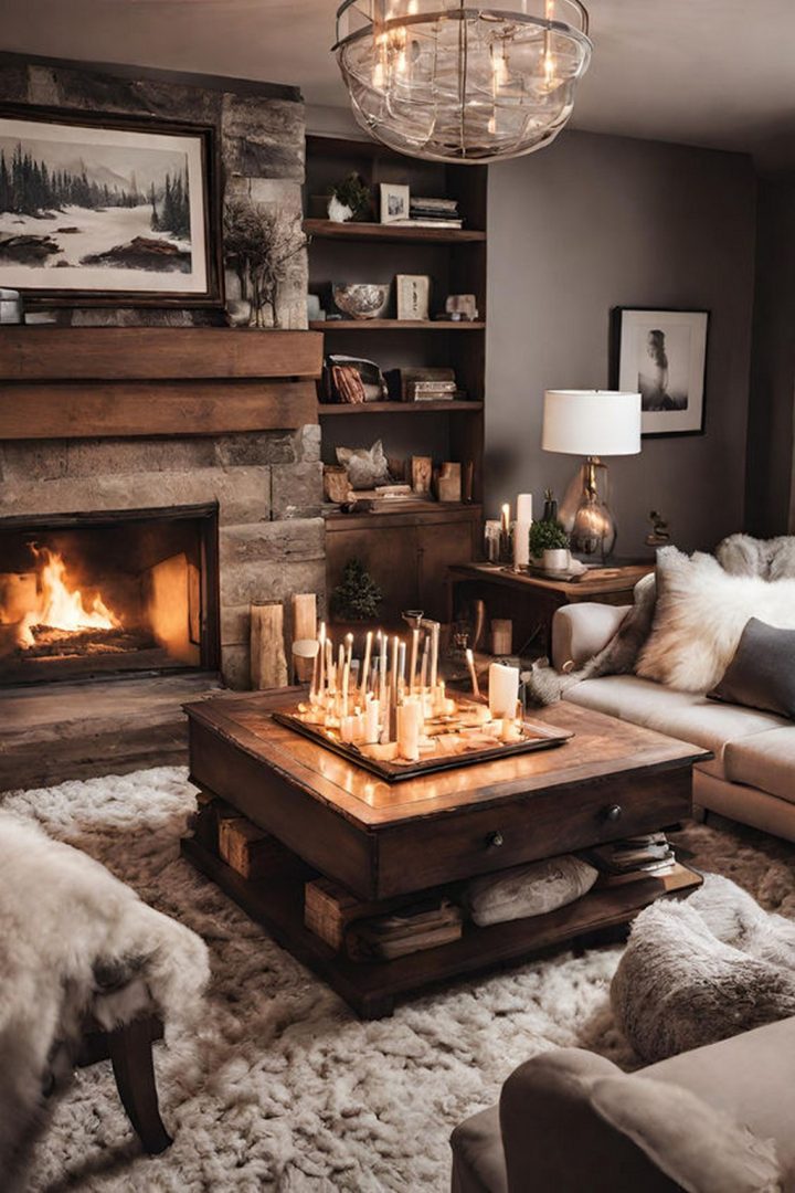 Create a focal point in the living area with a fireplace surrounded by natural stone. This feature adds both warmth and a touch of countryside charm.