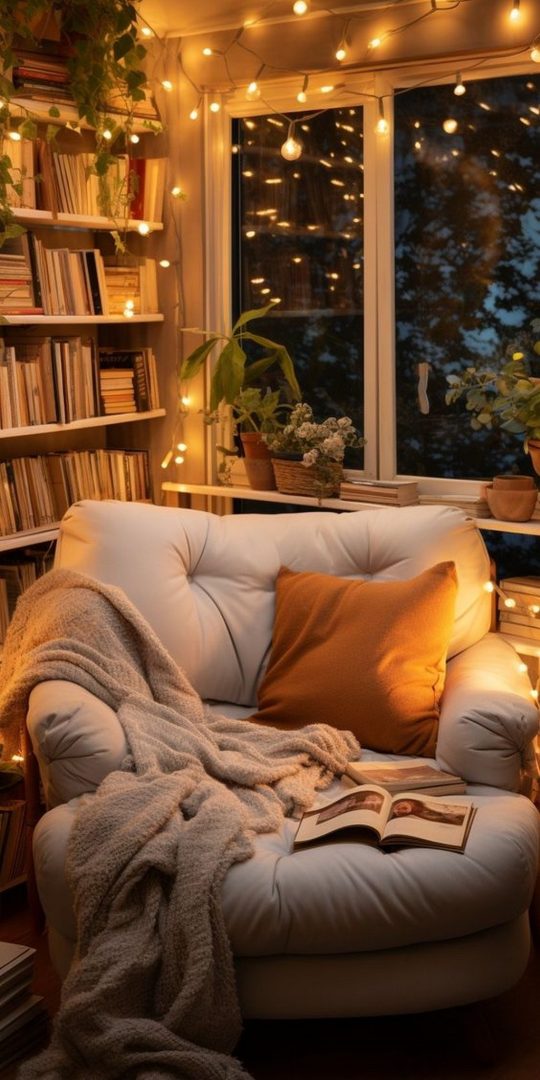 Dedicate a cozy corner as a reading nook with a comfortable chair, soft lighting, and a bookshelf filled with your favorite reads.