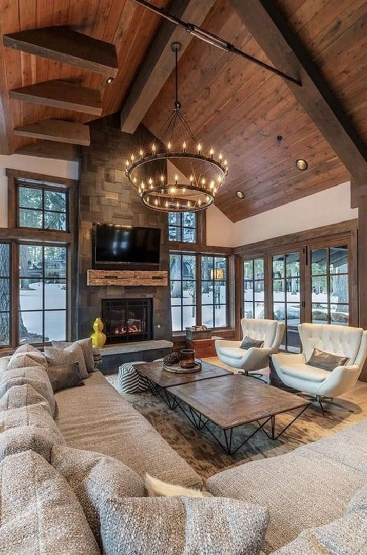 Furnish the living room with comfortable, oversized sofas and chairs. Add soft blankets and throw pillows for extra coziness.