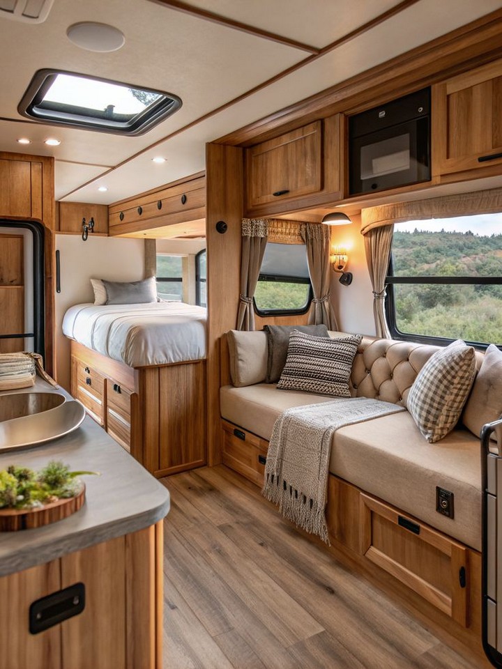 Transform the sleeping area with a space-efficient headboard featuring herringbone wood patterns. This can be created using lightweight materials with wood veneers to minimize weight while maximizing style. Integrate hidden storage compartments or reading lights for added functionality.