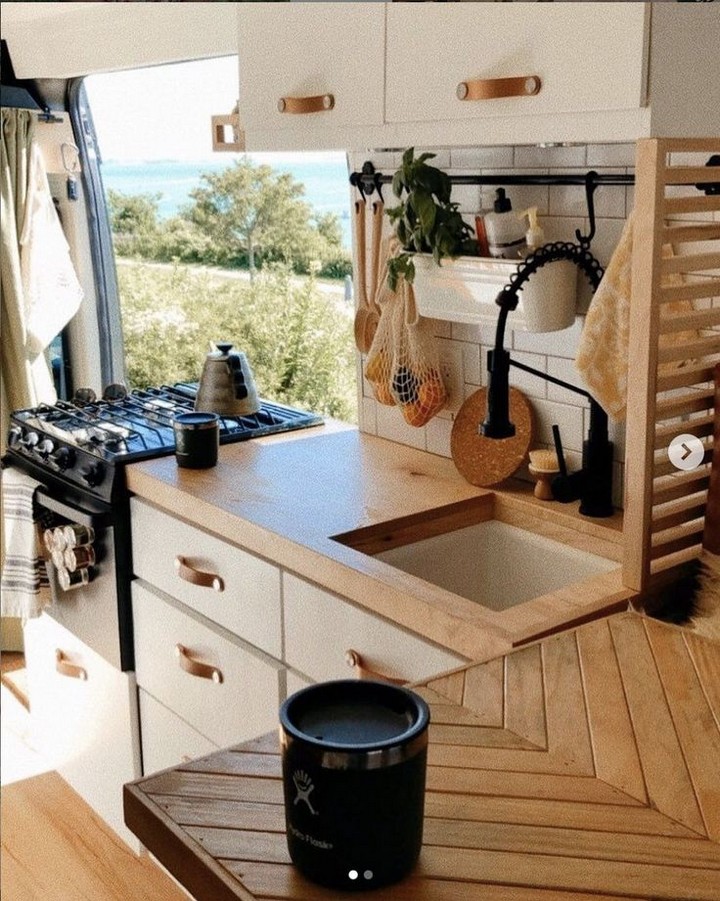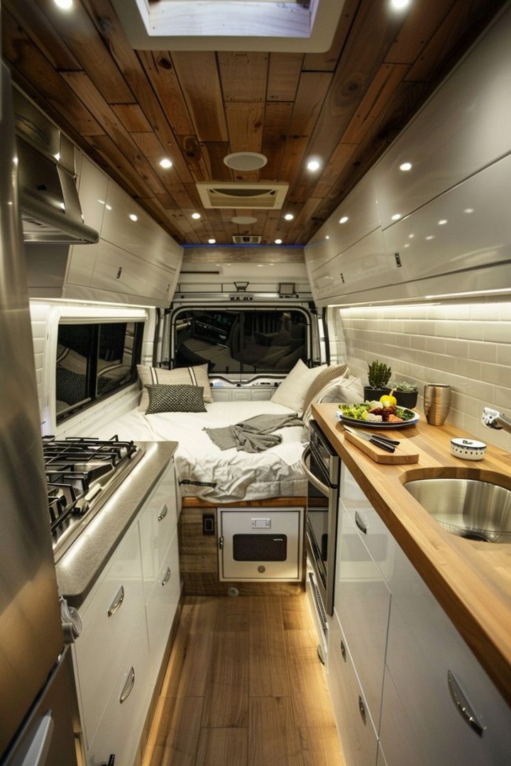 Replace upper cabinets with open shelving supported by wrought iron-style brackets. This not only creates a more spacious feel but also allows for displaying cherished items that make your adventure van feel like home. Secure items during travel with removable tension rods or custom-fitted holders.