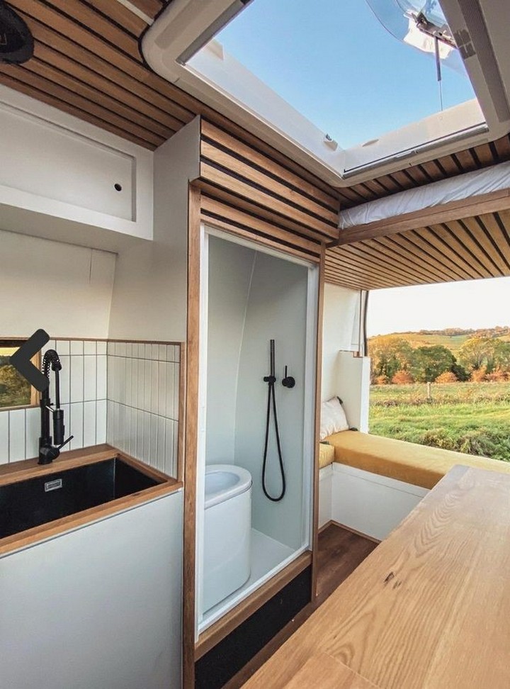 Space-saving barn doors serve both functional and aesthetic purposes in a van conversion. A miniature sliding barn door for the bathroom compartment adds farmhouse charm while saving precious floor space that would be lost to a traditional swinging door. Choose reclaimed wood or matte black hardware for authentic farmhouse appeal.