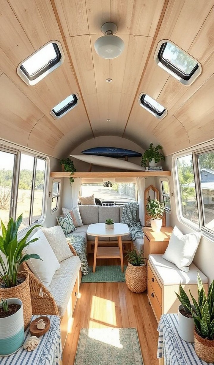 Transform the van ceiling with whitewashed wood treatments that brighten the space while adding subtle texture. This technique allows some of the wood grain to show through, creating dimension without darkening the interior, which is crucial in small spaces.