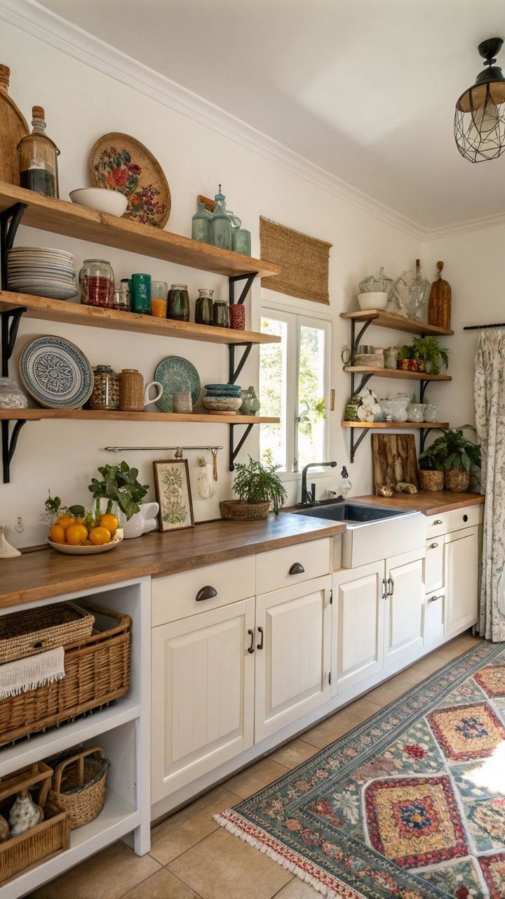 Replace traditional cabinets with open shelving to display your collection of modern and vintage kitchenware. Use colorful ceramics, glass jars, and textured baskets to add character.