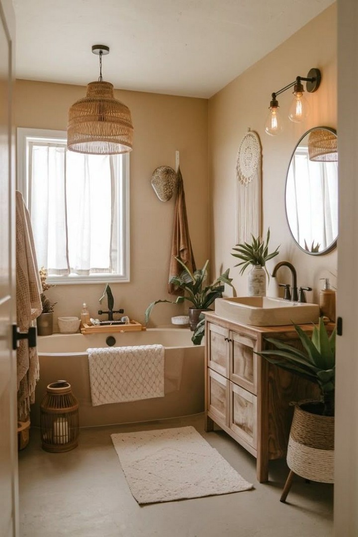 Create a spa-like retreat with clean modern lines and boho accessories. Add patterned tiles, woven baskets, and potted plants to give the space character.