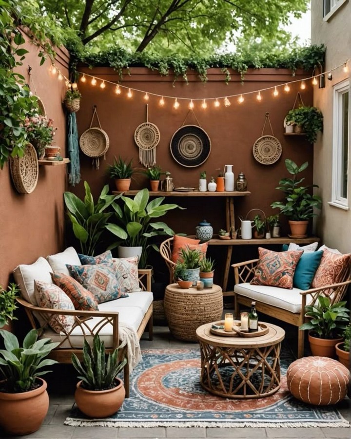 Combine modern outdoor furniture with eclectic accessories like patterned cushions, lanterns, and potted plants. String lights add warmth and create a cozy atmosphere.