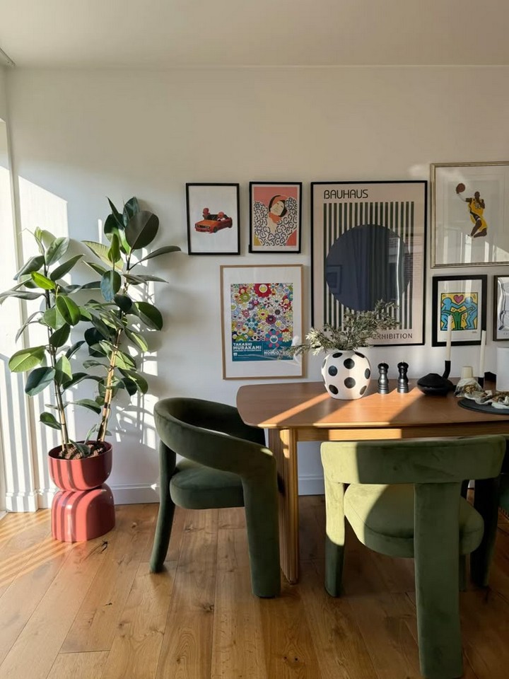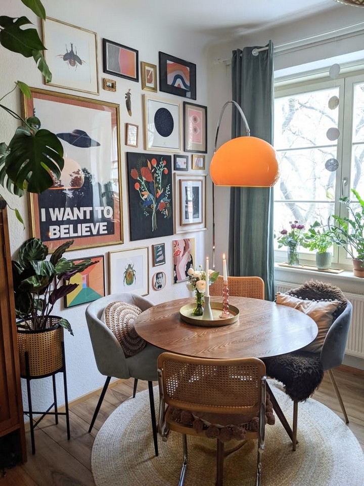 Turn your dining area into an art gallery with oversized modern art pieces. Pair them with eclectic dining chairs in varying colors and styles for an artsy vibe.