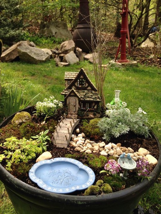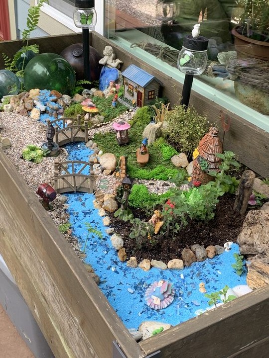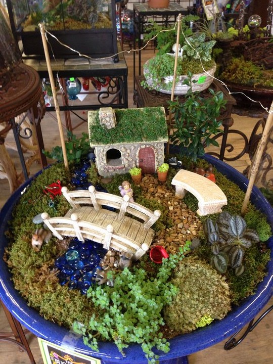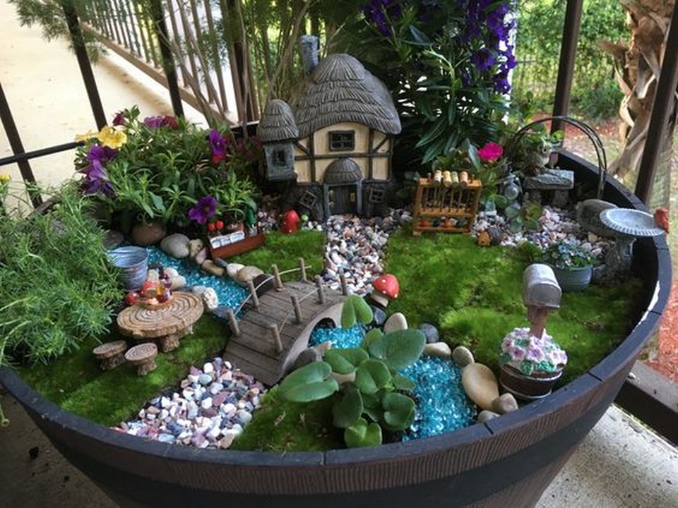 Include a tiny pond or stream with blue glass pebbles for water and miniature lily pads. Fairy figurines can sit by the water’s edge.