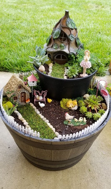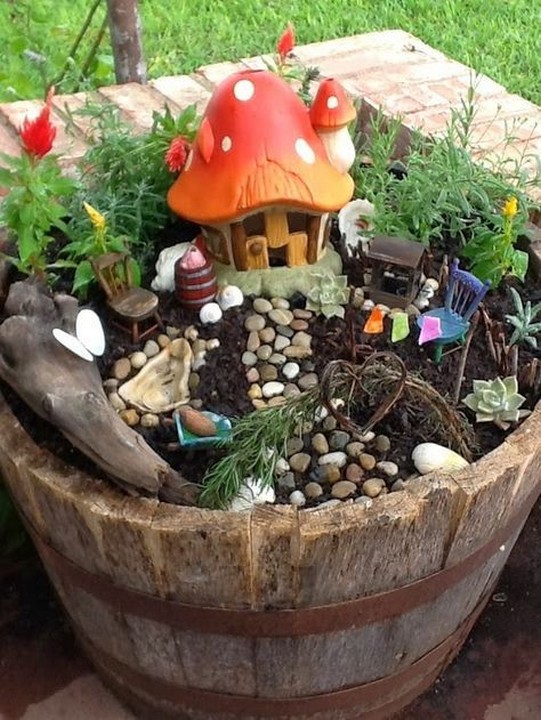 Use an old wine barrel as a large container for a fairy garden. Arrange succulents and fairy accessories to fill the space.