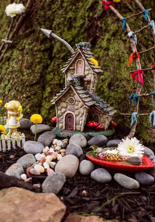 Build a lush and tropical fairy garden with ferns, moss, and brightly colored succulents. Fairy figurines can explore the vibrant landscape.
