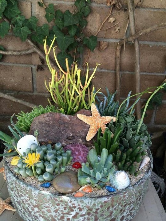 Build a coastal fairy garden with white sand, seashells, driftwood, and succulents that mimic underwater plants.