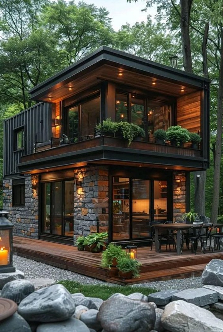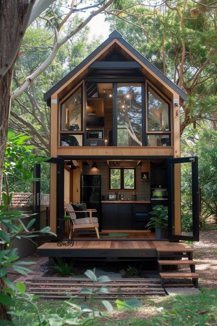 With its almost entirely transparent façade, this design blurs the line between indoor and outdoor living. The tiny house features floor-to-ceiling windows, creating a panoramic view of its surroundings. Privacy is cleverly managed with adjustable shades and smart glass technology.