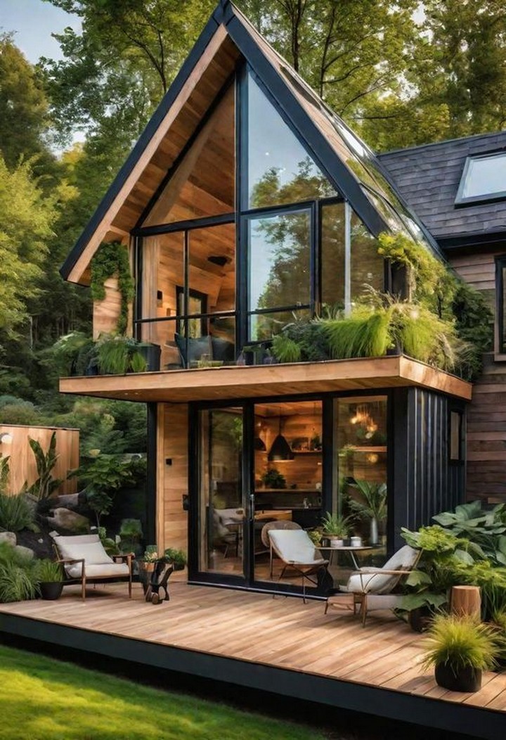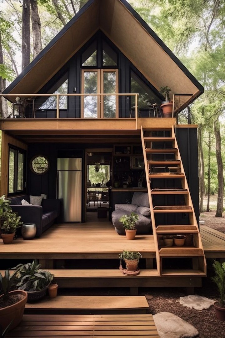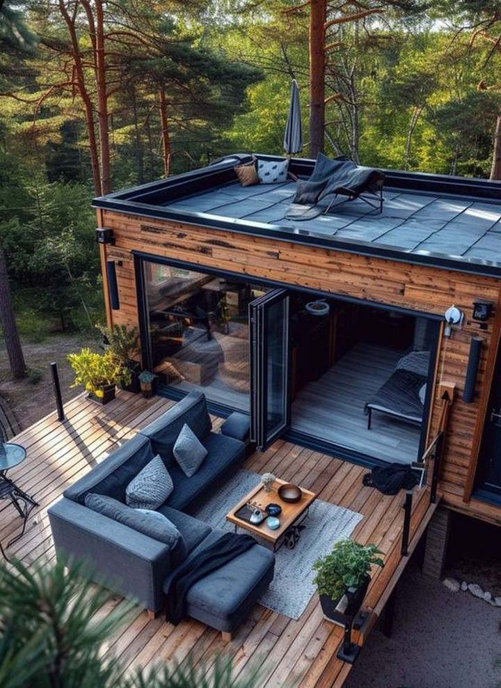 Focused on sustainability, this tiny house includes a green roof, solar panels, and rainwater harvesting systems. The exterior is made from recycled materials, while the interior uses low-VOC finishes and sustainable wood. This design represents the pinnacle of eco-conscious living.