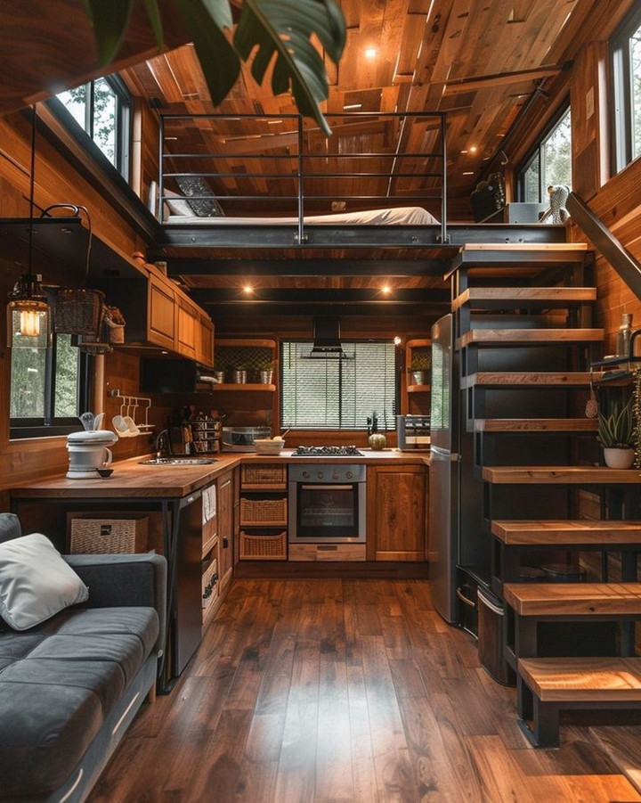 Elevated among the trees, this tiny house design integrates seamlessly with its natural surroundings. The elevated structure provides privacy and stunning views, while the interior features organic materials and large windows that bring the outdoors in.
