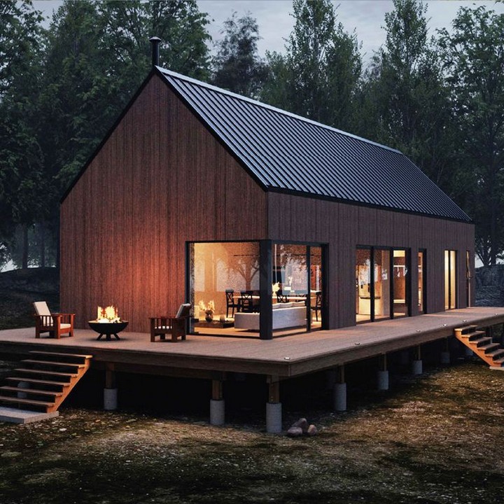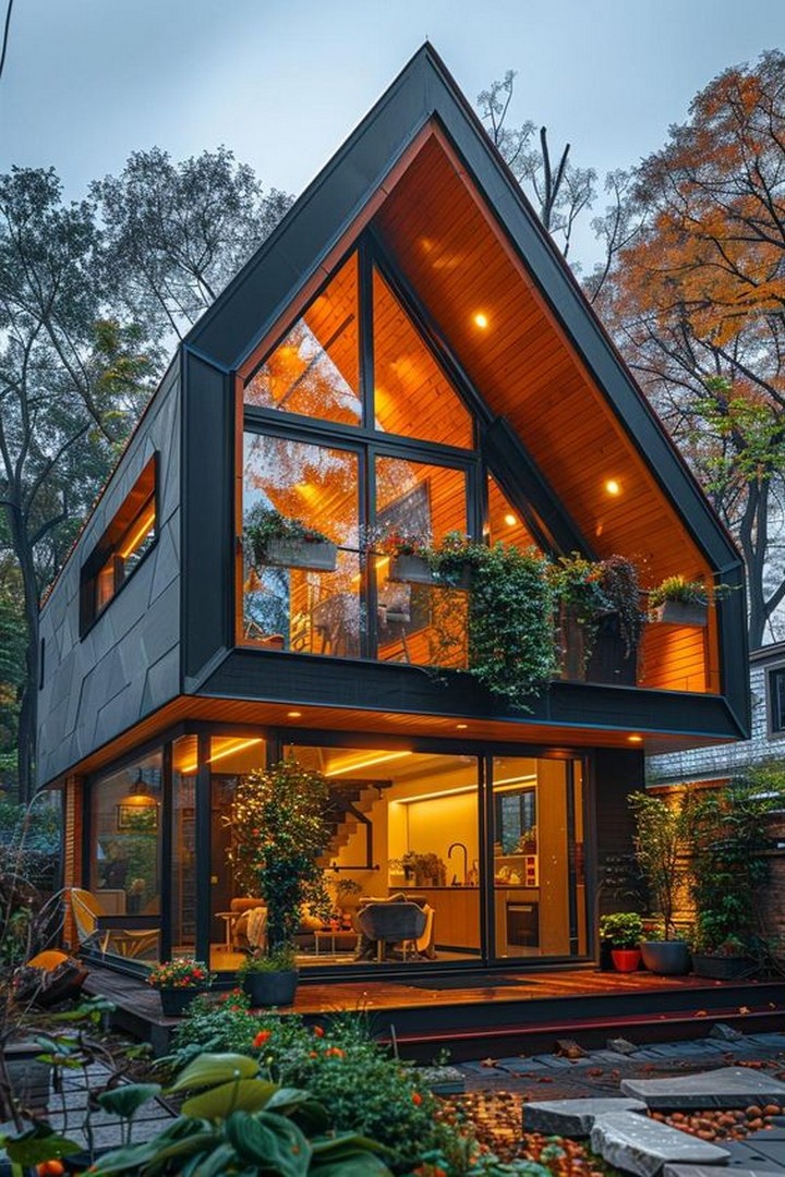 This modern take on the classic A-frame design incorporates large glass panels and a sleek metal exterior. The triangular shape creates an open, airy interior with a dramatic central living space and a cozy lofted bedroom.