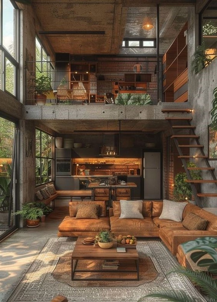 With a focus on maximizing vertical space, this design features a high ceiling and a spacious loft area that serves as a bedroom. The open-plan living space below is bright and airy, with smart storage solutions that keep the space uncluttered.