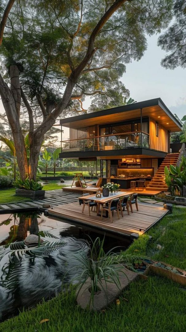 Perfect for waterfront living, this tiny house is built on a floating platform, allowing it to sit gently atop the water. The design includes a modern, angular exterior and expansive decks that extend the living space outdoors, offering beautiful views and relaxation areas.
