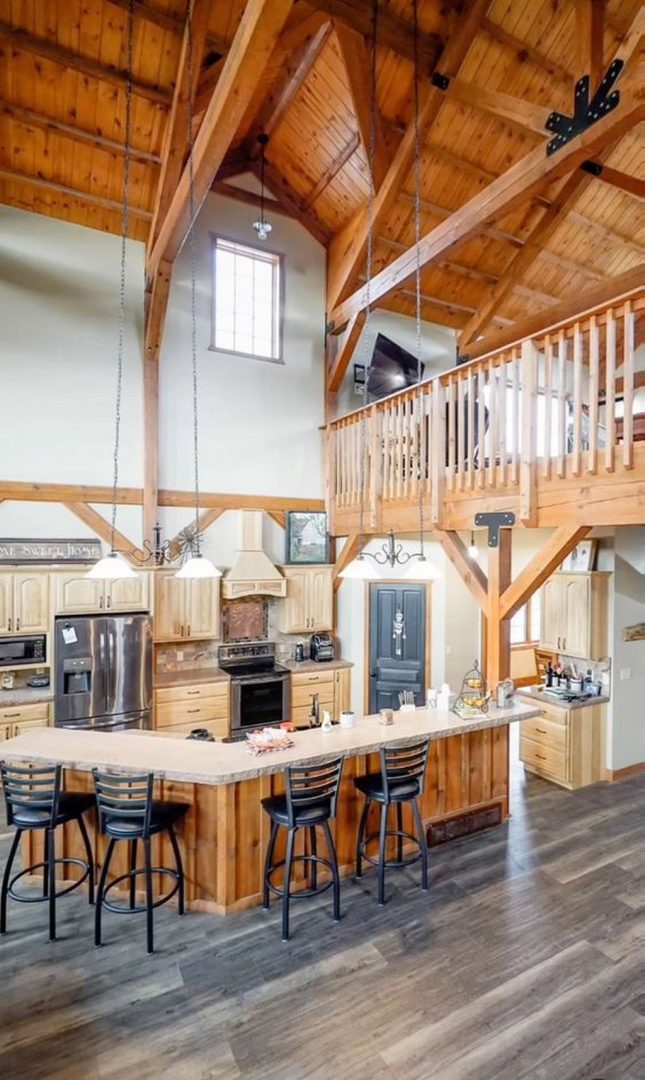 Introduce industrial-style pendant lights or chandeliers to add a modern touch. The contrast between industrial and rustic elements creates a visually appealing design.