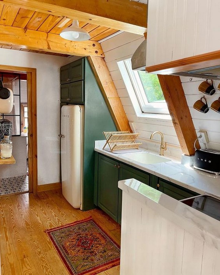 With pastoral elements such as floral patterns, gingham fabrics, and traditional furniture, countryside retreat interiors in tiny cabins provide a tranquil and idyllic ambiance.