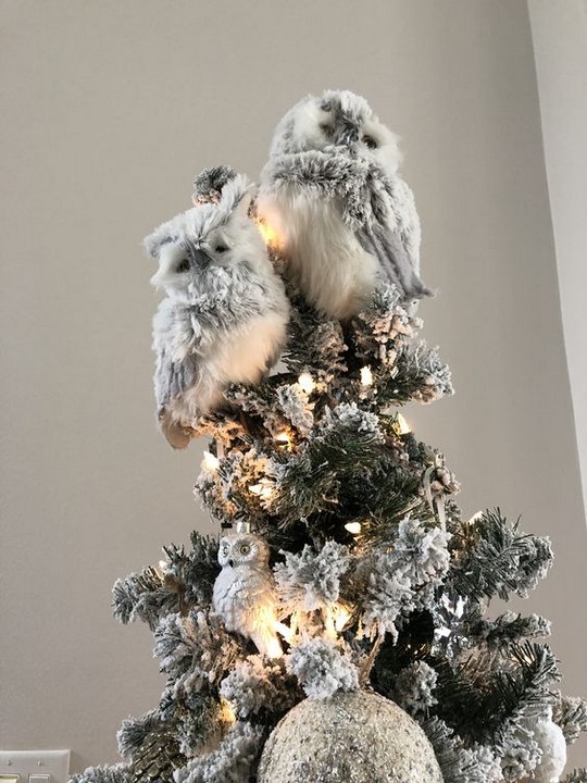 Animal or bird-shaped tree toppers, like a reindeer, owl, or peacock, can be whimsical and fit various holiday themes.